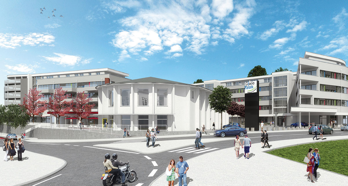 Das Gloria Palais auf dem über 10.000 m² großen Areal stellt einen Knotenpunkt der Möglichkeiten dar. Der fünfstöckige Bau bildet einen Halbkreis um das denkmalgeschützte ehemalige Gloria-Kino. Hier ist das Café Schien, die älteste Konditorei in Hanau, eine Billard Bar und eines der größten Kieser Trainingszentren ansässig. Medical Center und Gewerbeflächen: Das Gloria Palais beherbergt eine Vielzahl der nterschiedlichen Fachschaften, die sich zusammen mit den medizinischen Peripherieeinheiten, wie Apotheke, Sanitätshaus etc. und medizinisch betreutem Fitnessinstitut, zu einem ganzheitlichen Gesundheitszentrum ergänzen. Mit der Oberbank ist auch ein Finanzdienstleister und Versicherungen wie die IKK Südwest oder Signal Iduna vertreten.
